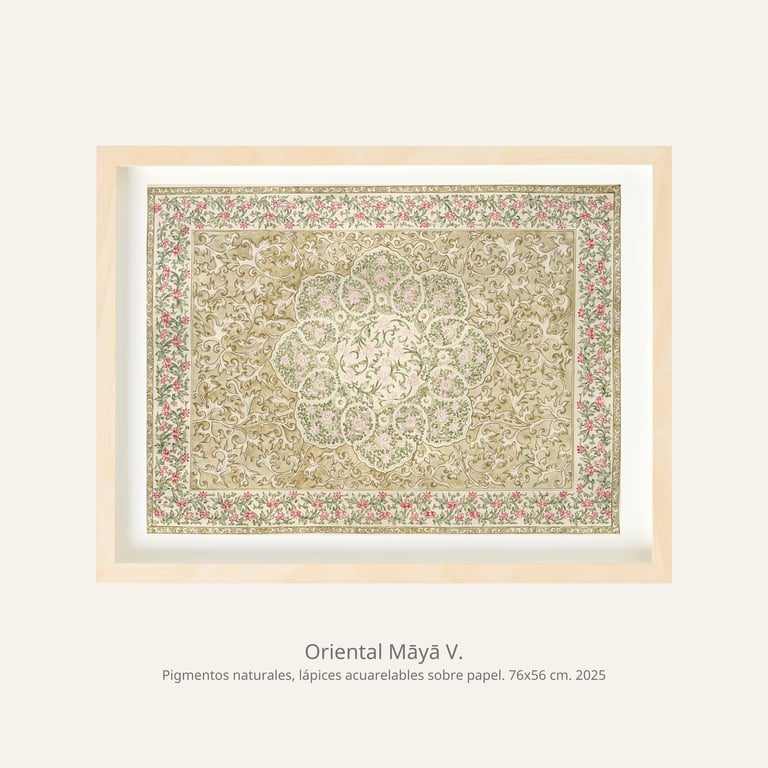 A continuación les mostramos un avance de Oriental Māyā una serie en desarrollo que se encuentra actualmente en proceso de trabajo. Esta compuesta por obras elaboradas con pigmentos naturales y lápices acuarelables sobre papel. En esta propuesta, cada pieza se concibe como un ejercicio de composición, en el que los elementos son estudiados y reorganizados para otorgar un nuevo sentido a la forma, revelando una lectura renovada de su propio lenguaje visual. La muestra propone un diálogo entre la tradición artesanal del Este asiático y la filosofía espiritual del subcontinente indio, entre la materia y la ilusión.