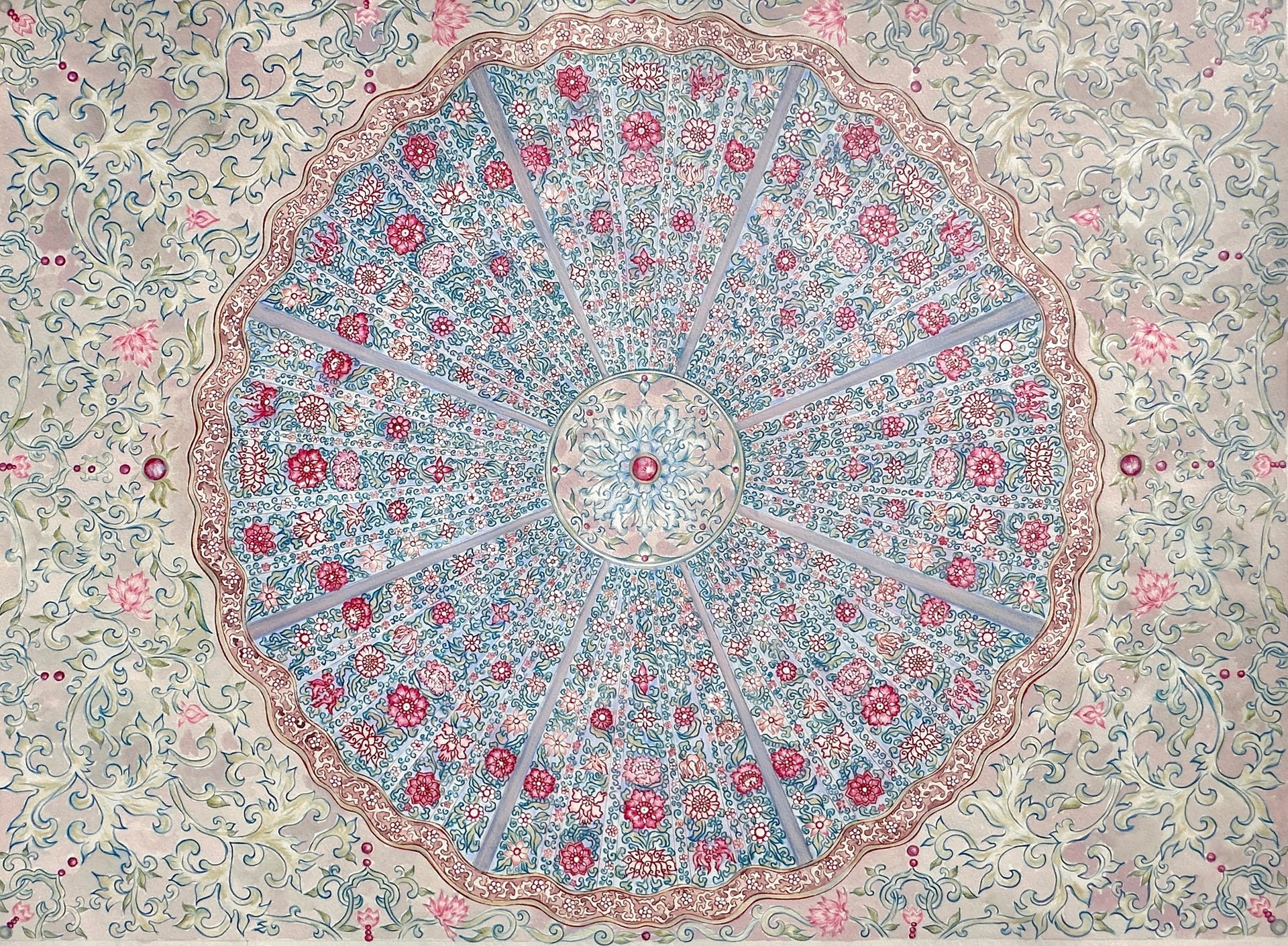 Las piezas están inspiradas en los motivos florales de la técnica china Dian Cui, también conocida como Tian Tsui, un arte ancestral que alcanzó su esplendor durante la dinastía Han 202 a. C.- 9 d. C. Esta técnica consiste en la creación de joyas ornamentales en oro y plata, decoradas con plumas iridiscentes del martín pescador y piedras preciosas como jade, coral rojo, ágata y perlas. Cada ornamento es una manifestación de delicadeza, sofisticación y riqueza visual simbólica. Además de otros elementos pertenecientes al libro "Ejemplos de Ornamento Chino" 1.867 del británico Owens Jones.