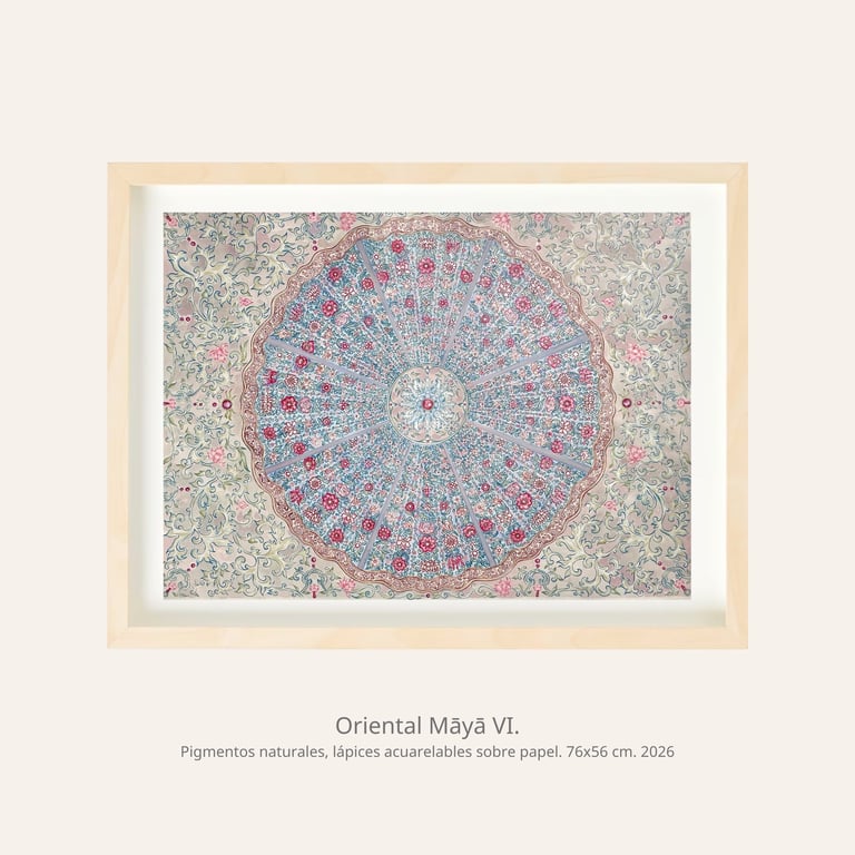 A continuación les mostramos un avance de Oriental Māyā una serie en desarrollo que se encuentra actualmente en proceso de trabajo. Esta compuesta por obras elaboradas con pigmentos naturales y lápices acuarelables sobre papel. En esta propuesta, cada pieza se concibe como un ejercicio de composición, en el que los elementos son estudiados y reorganizados para otorgar un nuevo sentido a la forma, revelando una lectura renovada de su propio lenguaje visual. La muestra propone un diálogo entre la tradición artesanal del Este asiático y la filosofía espiritual del subcontinente indio, entre la materia y la ilusión.